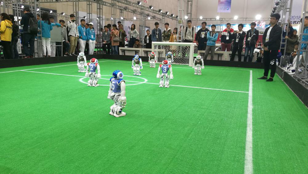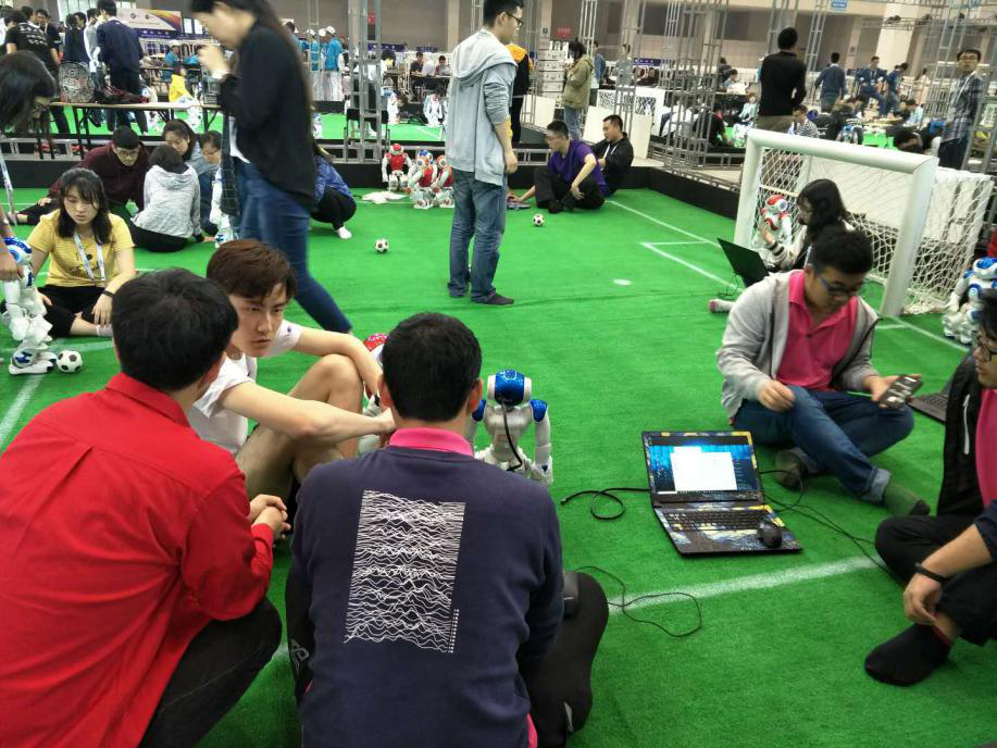在刚刚结束的2018RoboCup机器人世界杯中国赛标准平台组的比赛中,由公司教师卢健、校工程训练中心教师支双双指导,公司2016级研究生何耀祯为队长,2017级研究生刘通、陈旭、本科生夏秀鑫、周洋、盛铁雷、冀莹泽、董哲宇(计算机公司)为队员,以及六台nao仿人智能机器人组成的XPU足球队,取得第四名的成绩。