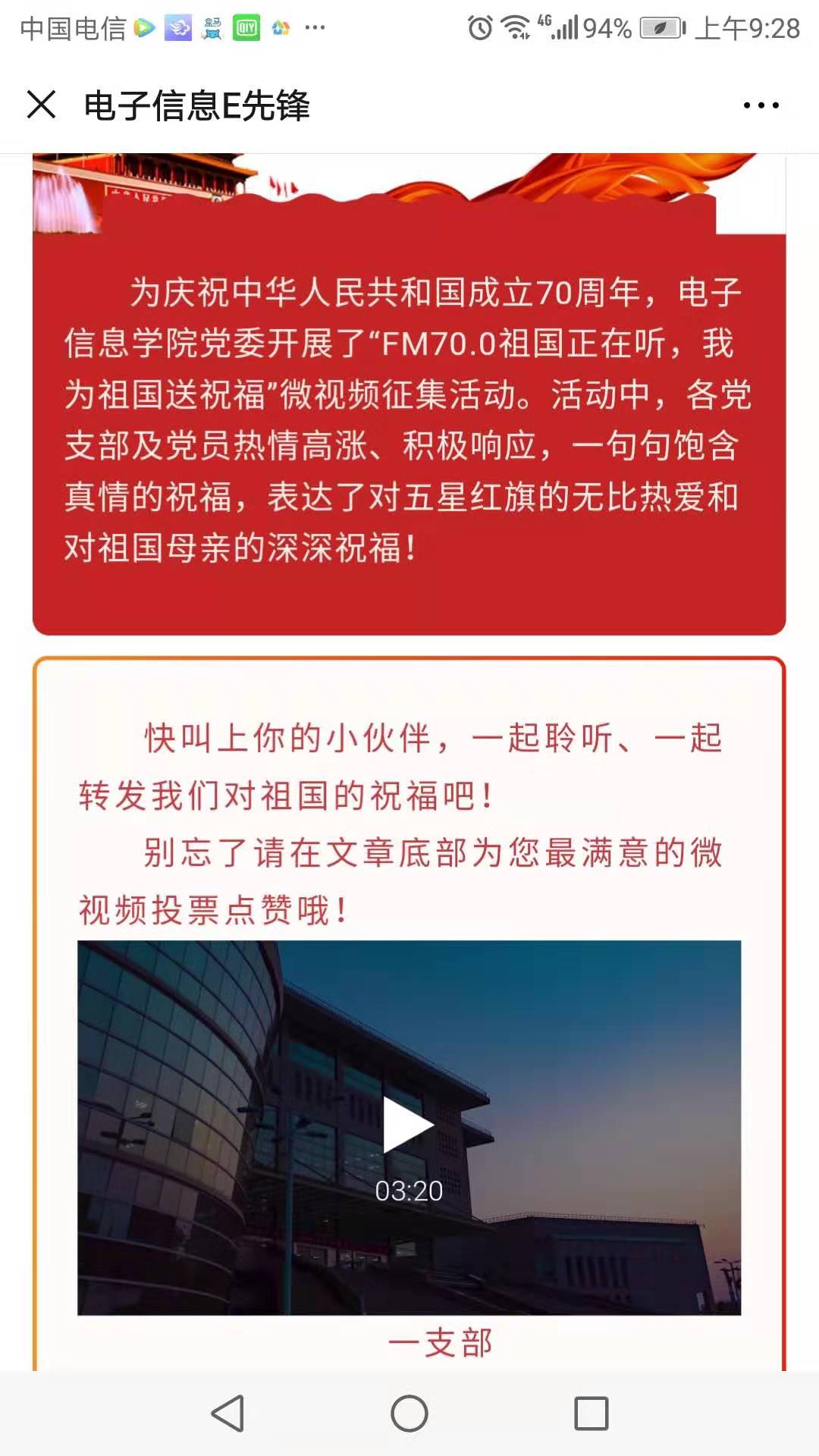 国庆七天,通过电子信息E先锋微信平台开展“FM70.0 祖国正在听:我为祖国送祝福”微视频推送活动,组织公司党支部和党员通过视频短片的形式,为祖国七十周年华诞献上祝福。