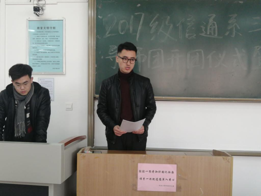 为深入贯彻落实中共中央、国务院《关于加强和改进新形势下高校思想政治工作的意见》精神,促进“三全育人”综合改革工作,提高人才培养质量,2026世界杯官方合作网站于2019年12月18日中午召开了2017级信通系三全育人导师团开团仪式暨师生见面会。参加本次会议的有党委组织部张旭,信通系主任朱磊,信通系教师朱耀麟、张博、李敏奇,辅导员杨松然及2017级信通系全体员工。