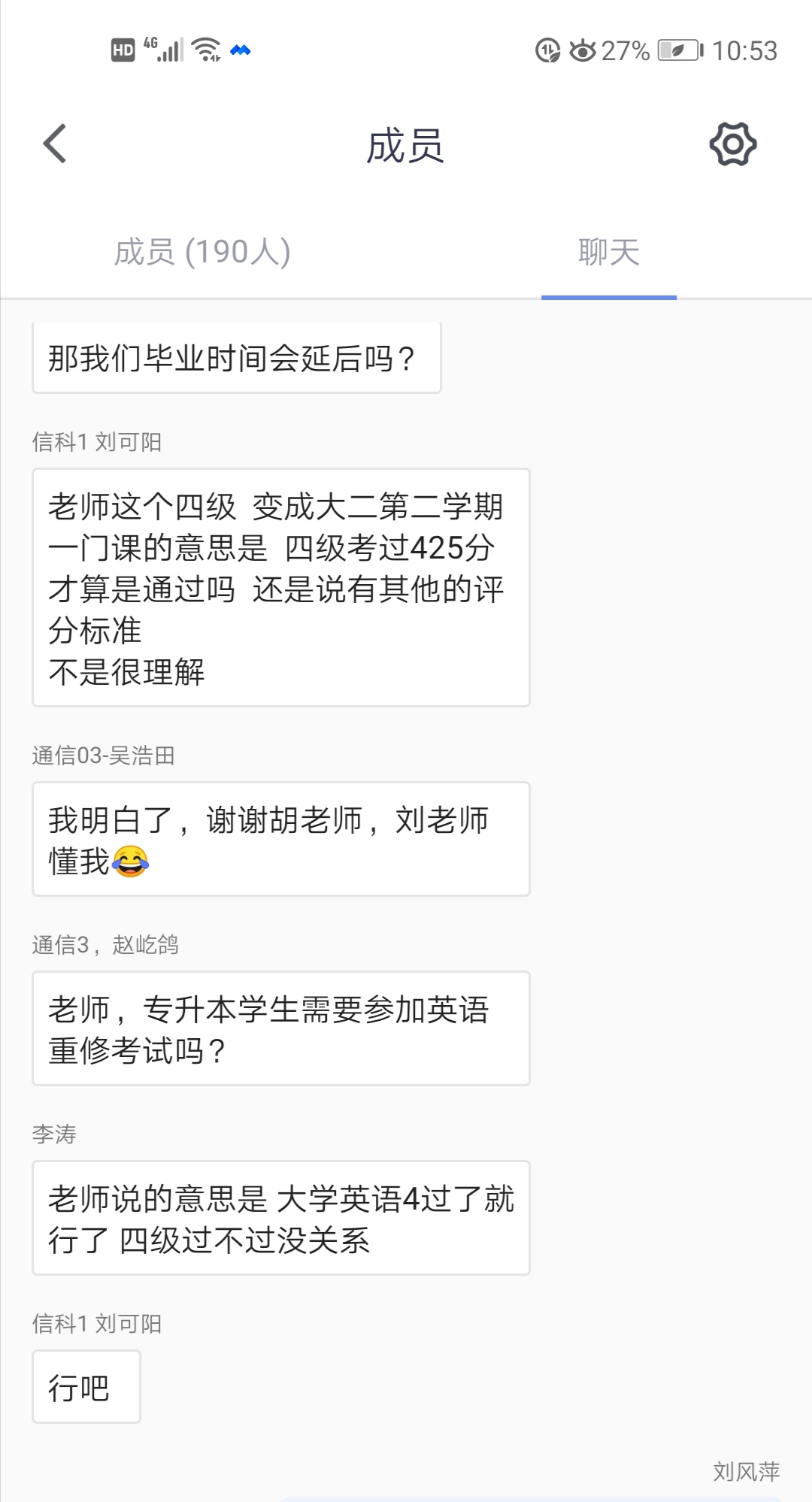 热心互动犹如定心丸。同学们纷纷从公选课、英语四级、学业成绩等方面提出了存在的疑虑,胡老师逐一耐心的为同学们释疑解惑,期间同学们的感谢之意频频刷频,使在线学业指导会议的氛围持续升温。