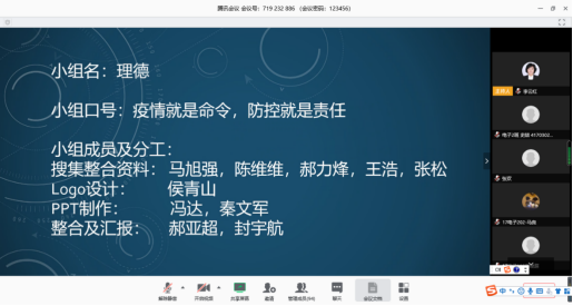 课前,员工以组为单位,分工合作,借助媒体网络,精心制作了每组的口号、组名、LOGO,搜集了新冠疫情宣传与防护知识,疫情防控期间的经典案例,制作了内容丰富、形式多样的PPT。同学们选择的案例有:福建泉州欣佳酒店坍塌事故、发国难财的市场伦理问题、疫情期间出售不合格口罩谋取暴利、最美逆行者(发哨人、吹哨人、天使、战士)、抗疫关键时期医护人员的脱离行为等。