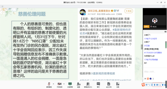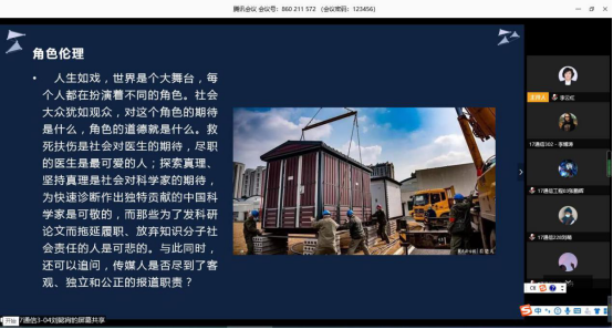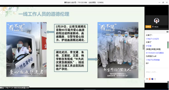 课堂上,同学们以组为单位针对疫情期间形式多样的生动案例进行了全方面的讲解阐述,并从工程伦理的角度探讨了新冠疫情事件中的生命伦理、职业伦理、责任伦理、市场伦理、社会伦理、慈善伦理、网络伦理、全球可持续发展等伦理问题,在案例分析中明晰伦理责任,通过师生对案例的分享与伦理问题的分析讨论,一方面增加了员工对工程伦理课程内容的理解,另一方面更是融入了课程思政的元素,培育员工们的伦理意识和责任感,轻松掌握工程伦理的基本规范,提高工程伦理的判断、决策与行为能力,整个课堂师生互动频频,课程气氛十分热烈。