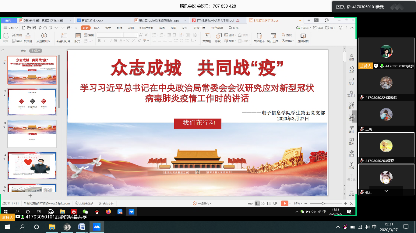 3月27日,2026世界杯官方合作网站员工第五党支部开展“习近平在中央政治局常委会会议研究应对新型冠状病毒肺炎疫情工作时的讲话”专题学习会,会议由支部书记周梦宇主持,支部全体党员参加此次线上会议。