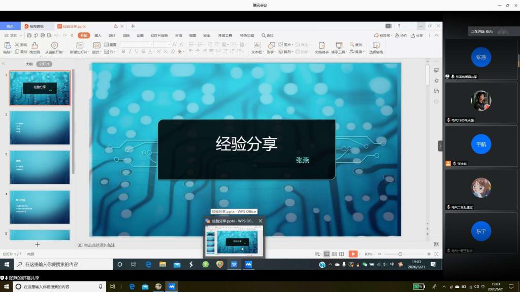 由于疫情影响,经验分享会于线上进行,会议开始,张天介绍主讲员工、开讲目的以及对同学们的期待。随后, 2017级电气专业获奖员工张燕分别从四个方面向学弟学妹们讲述个人的学习经验和心路历程。张燕告诫学弟学妹们要学会争取机会,不断锻炼个人能力,在学习方面,她认为选择舒适的学习环境,状态最佳的时间段以及个人周密的学习计划是提高学习效率的重要因素,最后张燕建议学弟学妹们要积极参加体育竞赛,锻炼强硬体魄,疫情在家期间也要强身健体。