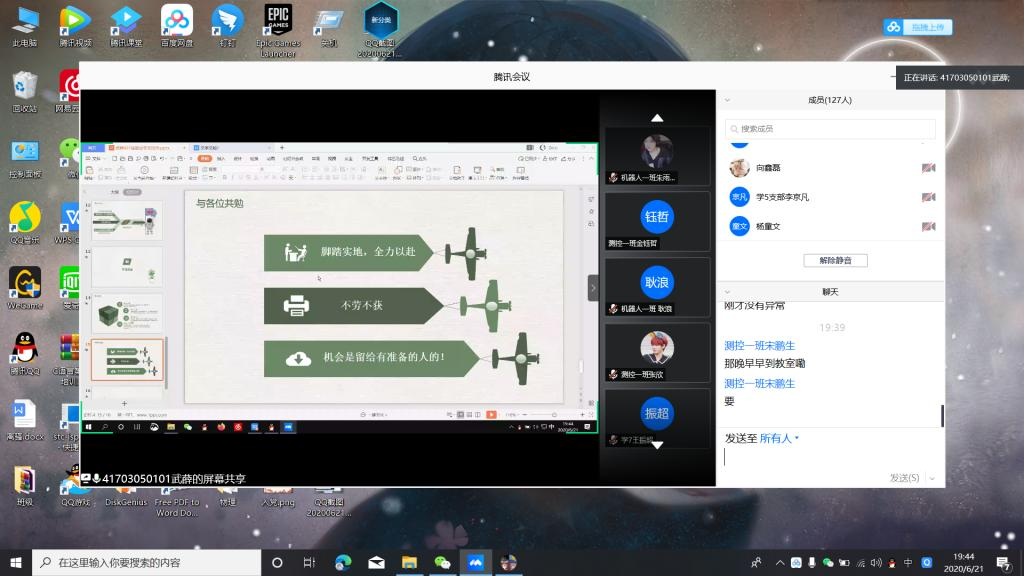 本次线上分享会的开展,不仅给疫情期间19级新生们一些“宅家建议”,让他们在上网课的同时能调整心情,强健体魄,同时还能尽早树立大学目标,并尽快适应老员工活,创造属于自己的老员工活。(撰稿:张天、周梦宇,审核:杨恩科)