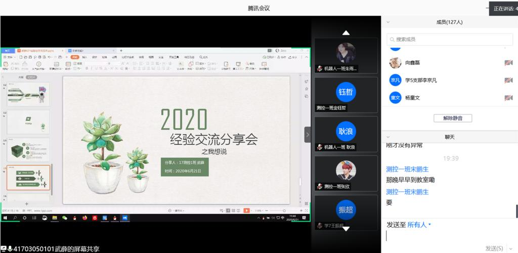 由于疫情影响,经验分享会于线上进行,参与此次活动的4名同学积极准备,以学习为切入点,内容涉及老员工活、学习、以及科技竞赛各个方面,着重介绍同学们关注的大学英语的学习、参加与专业相关的科技竞赛活动等问题,从自身的切身经历及学习心得出发,以事实为依托,生动、灵活的讲述了各方面的学习经验。与此同时,兼顾日常生活,课外实践活动等诸多方面的情况介绍,引导同学们积极投入到丰富多彩的老员工活中,在同学们中产生了积极地反响。最后,针对同学们提出的学习、生活等方面存在的困难和问题一一做出了详尽的解答,收到了良好的效果。