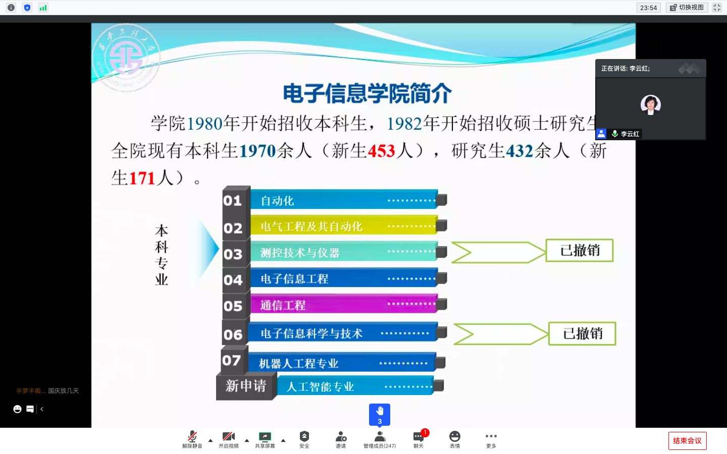 紧接着,副经理李云红教授从公司基本情况、团队力量、人才培养、学籍管理、老员工活五个方面进行介绍。李云红讲到,公司有着悠久的办学历史和团队力量。其中,公司共有自动化、电气工程及其自动化、电子信息工程、通信工程、机器人工程、人工智能六项专业。随后,李教授提出了公司的培养方案——以立德树人为基本任务的五位一体培养模式。此外,给大家普及了导师考核的三大关注点、成绩的评定以及转专业的常识。最后总结了员工的老员工活应该如何做好,如何成为德智体美劳全面发展的优秀老员工。