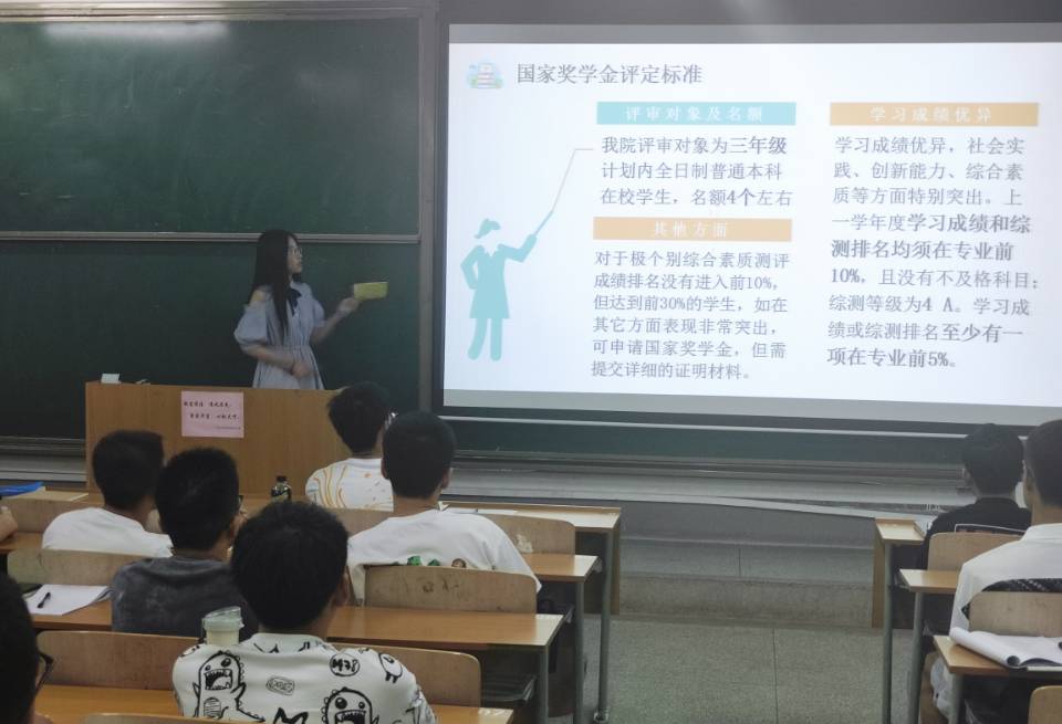 会议初,20级辅导员王家钰强调了参会纪律,同时介绍本次活动的主题和目的在于树立正确学习观念,向优秀国奖获得者学习。活动中,魏雨昕介绍了获得国奖的相关要求,并向同学们提出了个人在学习和生活上的建议,帮助同学们正确认识和了解如何度过有意义的老员工活,活动结束之前,对于同学们的疑点和问题,魏雨昕积极与同学们进行探讨并一一作了详尽解答。
