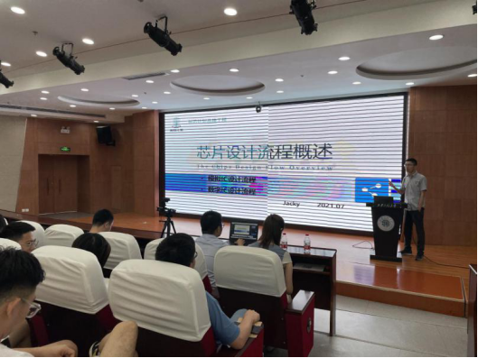 于兆杰工程师为师生作了题为《芯片设计流程概述》的技术讲座,完整的介绍了模拟IC芯片设计流程和数字IC设计流程。从进入软件建立文件开始,到编辑测试环境开始仿真,再到交、直流分析,最后设计版图、后端验证。每一个环节都做了详细演示和讲解。