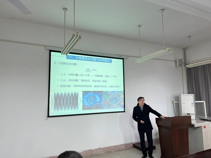 任志刚教授向大家介绍了当前智能计算领域的难点和热点问题,并引出了能够有效解决当前问题的基于“变量分组”的协同代理优化方法。随后,任教授分享了他处理大规模问题时“分而治之”的解决思路,即将原大规模问题分解成若干个可分的中低维子问题,实现对原问题的间接求解。最后任志刚教授结合他目前在研的项目,对大规模协同代理优化方法在国内外的应用做了讲解。