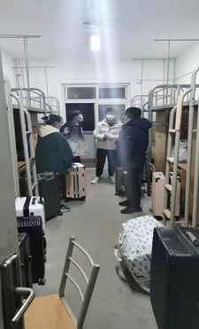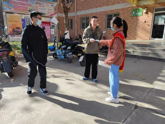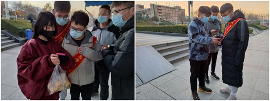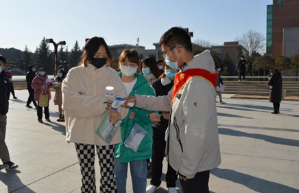 志愿者们在宿舍楼下提醒同学们戴口罩