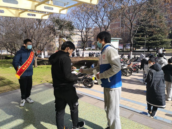 青年志愿者协助老师检查出入校门人员请假信息及员工行程卡