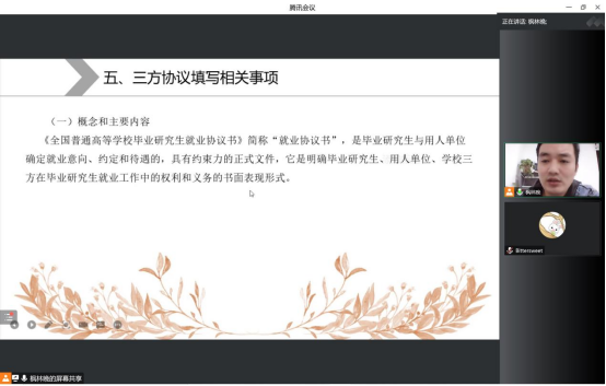 为保证线上动员会效果,本次动员大会分三场进行,全覆盖本科及研究生所有毕业班同学。会上,公司就业辅导员黄木委针对当前就业形势、考研、求职过程中遇到的问题与同学们进行了深入交流,就三方协议填写的相关事项为同学们进行了详细说明。针对当前考研就业面临人数多、难度大、竞争激烈的严峻形势,号召全体毕业生要端正心态、理性选择,更加积极主动面对考研就业过程中遇到的问题。同时,他还希望同学们合理定位就业期望,积极主动提高求职技能,做好充分的求职准备,鼓励同学们充分做好就业准备,大胆拓宽就业渠道,不断提高自身考研就业核心竞争力。