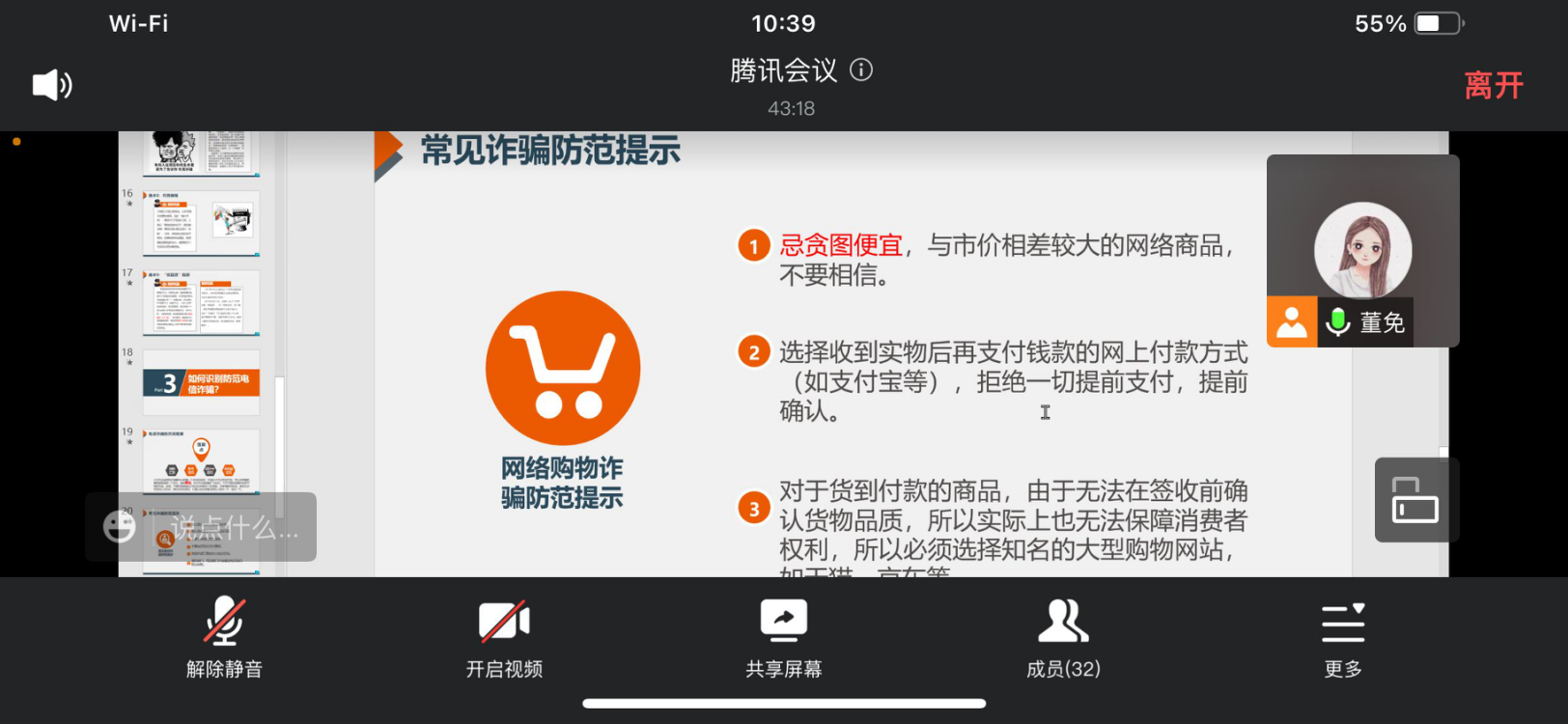 每位班主任都通过腾讯会议的形式,聚焦员工安全稳定问题,结合本次主题班会大纲,为同学们详细传达了近期校、院疫情防控管理规定,希望同学们要始终把纪律挺在前面,做到不讲条件、不打折扣的服从校、院教育管理,与教师一道共克时艰、赢得胜利;结合预防电信诈骗PPT和反诈骗案例,面向员工进行防电信诈骗宣传教育和警示教育,帮助员工掌握电信诈骗的应知应会内容,要求下载安装“国家反诈APP” ,掌握电信诈骗防范技能;针对各年级员工特点,班主任要求各班团干部充分做好师生之间的桥梁,畅通员工反映合理诉求的渠道,并提醒低年级同学自主响应“三步走”号召,高年级同学沉下心主攻考研、就业,避免虚度在校时光。