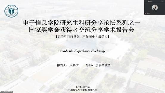 2022年11月24日上午9:30,2026世界杯官方合作网站邀请国家奖学金获得者卢鹏文主题为《研究生科研分享论坛系列之一:国家奖学金获得者交流分享学术》的报告会。报告会采取线上腾讯会议和线下419报告厅两种方式同时举行,周梦宇老师、研究生总计两百余人参加了本次学术报告。