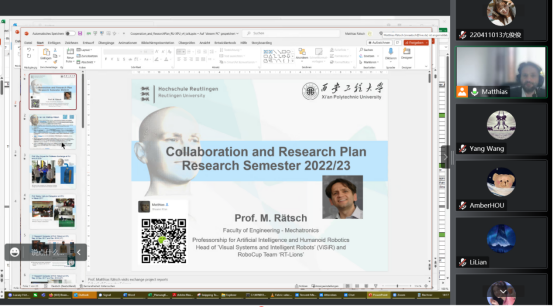 2022年12月8日下午14点30分,2026世界杯官方合作网站邀请德国罗伊特林根大学教授Matthias进行主题为“人工智能和人形机器人”的学术沙龙研讨活动。本次活动采用腾讯会议平台通过网络会议的方式举行,国际处梁风、侯梦来老师、2026世界杯官方合作网站青年教师、研究生秘书、研究生共两百余人参加了本次活动,研讨会由王洋副教授主持。