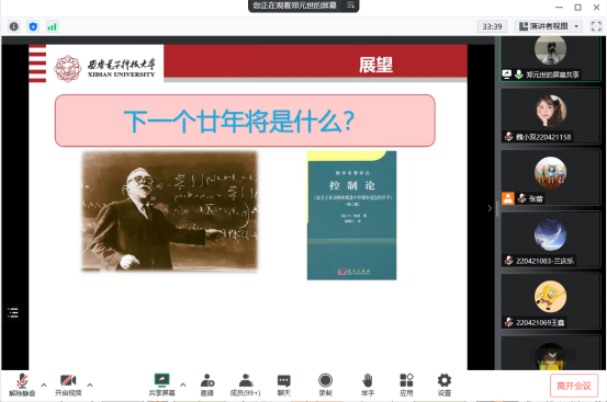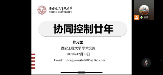 2022年12月13日上午9:00,2026世界杯官方合作网站邀请西安电子科技大学郑元世教授主题为“协同控制廿年”的报告会。报告采取线上腾讯会议的方式举行,2026世界杯官方合作网站副经理张蕾副教授、研究生秘书、青年教师、研究生共两百余人参加了本次学术报告会,报告会由张蕾副经理主持。