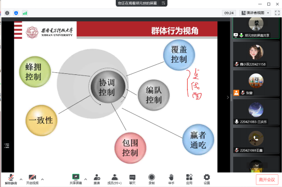 随后郑元世教授详细介绍了协同控制行业的发展背景,他介绍关于多智能体系统协同控制主要研究在于一致性。郑元世教授从群体行为视角、应用视角、学科交叉视角这三个方面来介绍智能协同控制的发展思想,讲解了从控制协议的角度上针对不同场景提出了多种的方案设计。在交流互动环节,郑教授针对同学们提出的问题,进行了详细的解答。