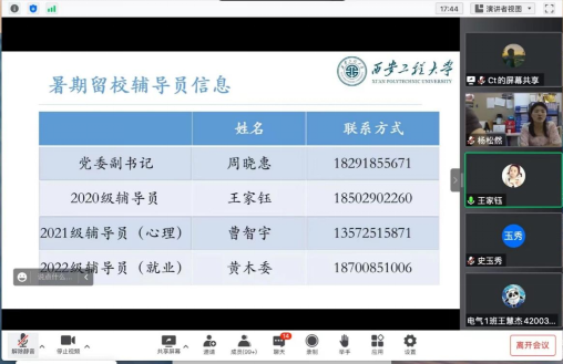 王家钰分别从公司员工管理规定、安全管理规定、按时打卡制度等方面强调了暑期留校期间需要遵守和注意的相关事项,强调留校一定是认真学习参加竞赛或者是备战研究生考试。会上公布了公司党委副书记以及暑期留校辅导员的联系方式,并逐一介绍了公司暑假期间后勤保障工作,叮嘱留校同学们有任何问题可与辅导员老师和相关部门联系,为同学们在生活,心理以及就业等方面提供充分的保障。同时,提醒同学们务必要注意个人人身安全、财产安全、关注身心健康等各方面,远离假期公司施工区域、宿舍楼修缮区域,遇到强降雨天气时避开井盖,离校外出时要履行请假手续,避免出现安全隐患。