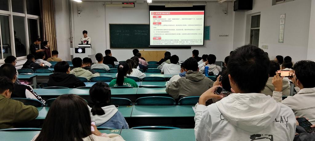 支部组织委员张吉康细致深入地为同学们讲解了如何撰写入党申请书,重点介绍了入党申请书的书写格式和注意事项,对易错点进行了说明,并鼓励新生们积极向党组织递交入党申请书,在青春的征程上持续奋斗,用坚定的理想信念谱写大学新篇章。
