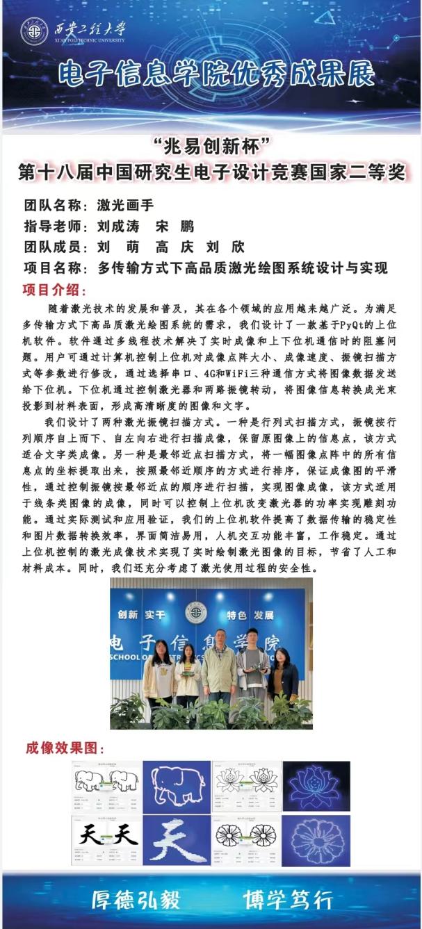 刘萌、高庆两位同学本次分享的题目是《多传输方式下高品质激光绘图系统设计与实现》。她们首先讲述了参赛前期的准备工作,重点分享了自己参赛如何进行选题和项目规划,特别强调项目选题要具有实际应用价值,要能够解决现实的问题。随着国家以“十四五”规划和2035年远景目标为指引的发展战略不断落实,激光制造正加快推动中国制造业实现转型升级,越来越多的工作领域采用激光绘图来完成各种需求,他们的选题就是迎合这个需求来确定的,有很重要的实用价值。接下来她们为同学们讲述了系统的总体设计,包括设计结构图、硬件实物图、软件设计图以及效果图。最后他们分享了自己研电赛现场参赛经验,包括对参赛作品中技术论文的撰写、答辩PPT的制作、作品展板的设计以及作品提交格式的要求等。最后总结了在比赛过程中的容易被扣分的事项,并预祝师弟师妹们在明年的赛事中取得好成绩。