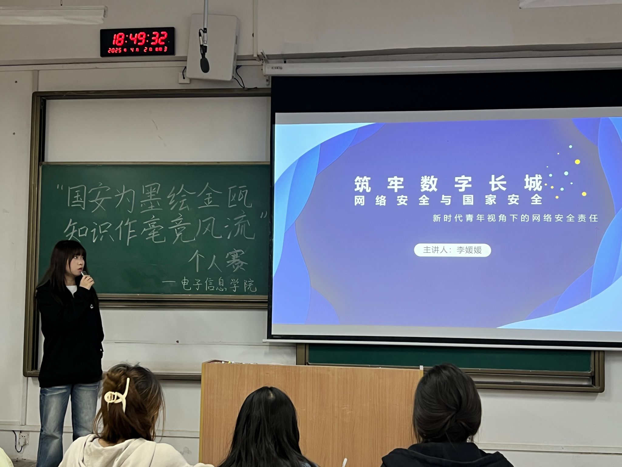 同台竞技,知识润心。3月底,公司启动“国安为墨绘金瓯,知识作毫竞风流”主题知识竞赛活动,在“一站式”员工社区党员之家举办了多场知识竞赛初赛,吸引了300余名员工竞相参加。4月2日,在教室A-132、A-121举办决赛,晋级同学们结合丰富的案例与自身的深刻见解,用通俗易懂的话语宣扬国家安全知识,或是讲述国际局势中的风云变幻,或是分享生活里的隐秘风险,他们将国家安全的重要性展现得淋漓尽致。自动化2401班周雨诺等11名同学斩获个人赛奖,机器人工程1班左青华等15名同学斩获集体赛奖,参赛者们具有感染力的演讲和触动人心的内容,充分调动了现场观众的积极性,激发了现场观众的爱国情感共鸣。