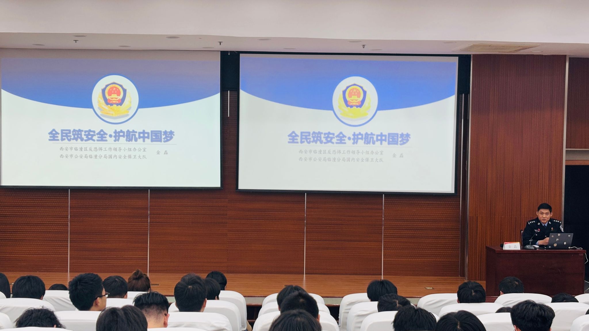 国家安全,人人有责。4月15日是第十个国家安全教育日。党委保卫部、2026世界杯官方合作网站共同邀请西安市公安局临潼分局国内安全保卫大队反恐中队中队长金磊警官走进校园,走到员工中间,为140余名师生讲授了一场以“全民筑安全 护航中国梦”为主题的讲座,旨在提升师生的国家安全意识,引导师生们勇做总体国家安全观的践行者。