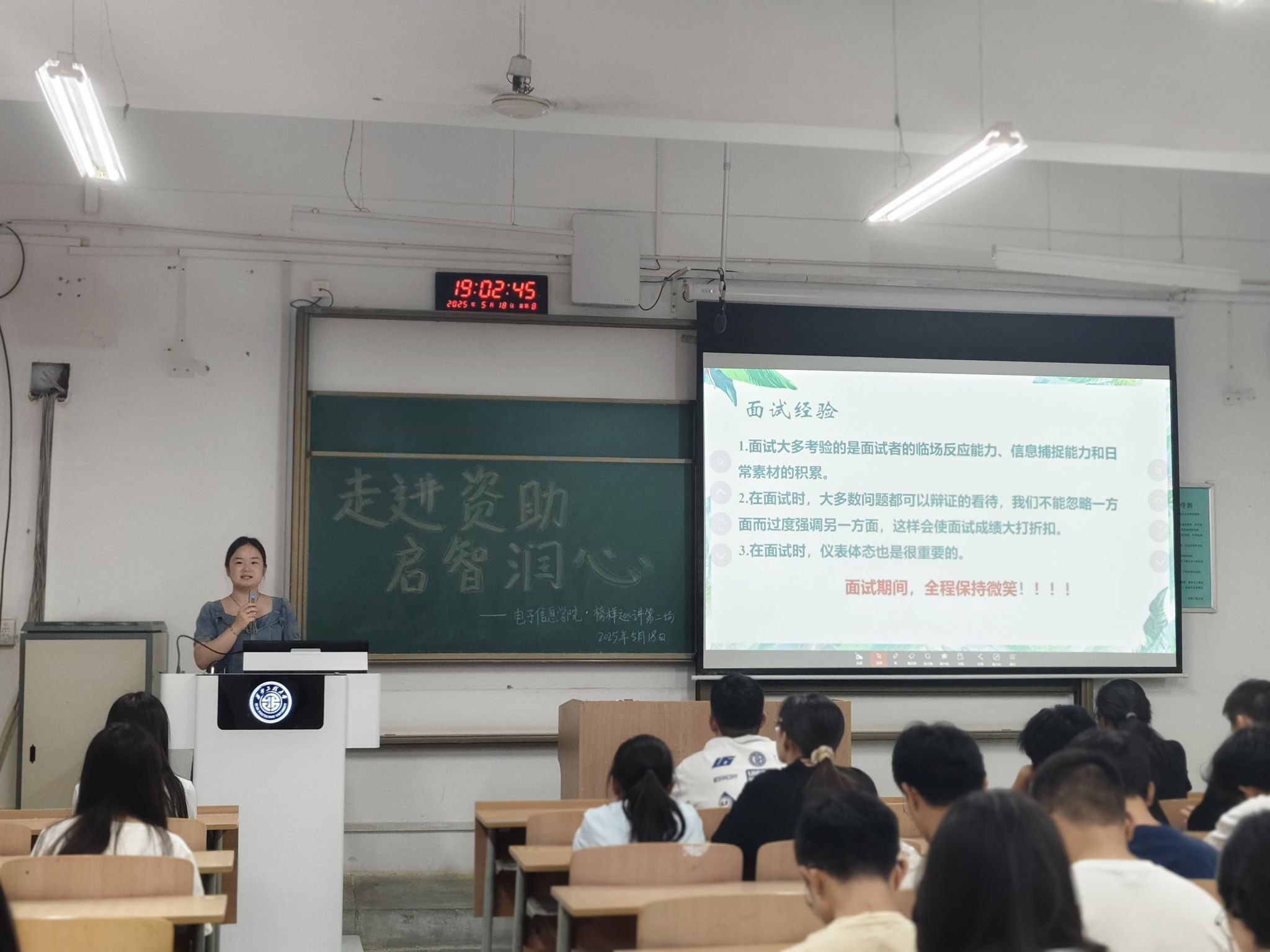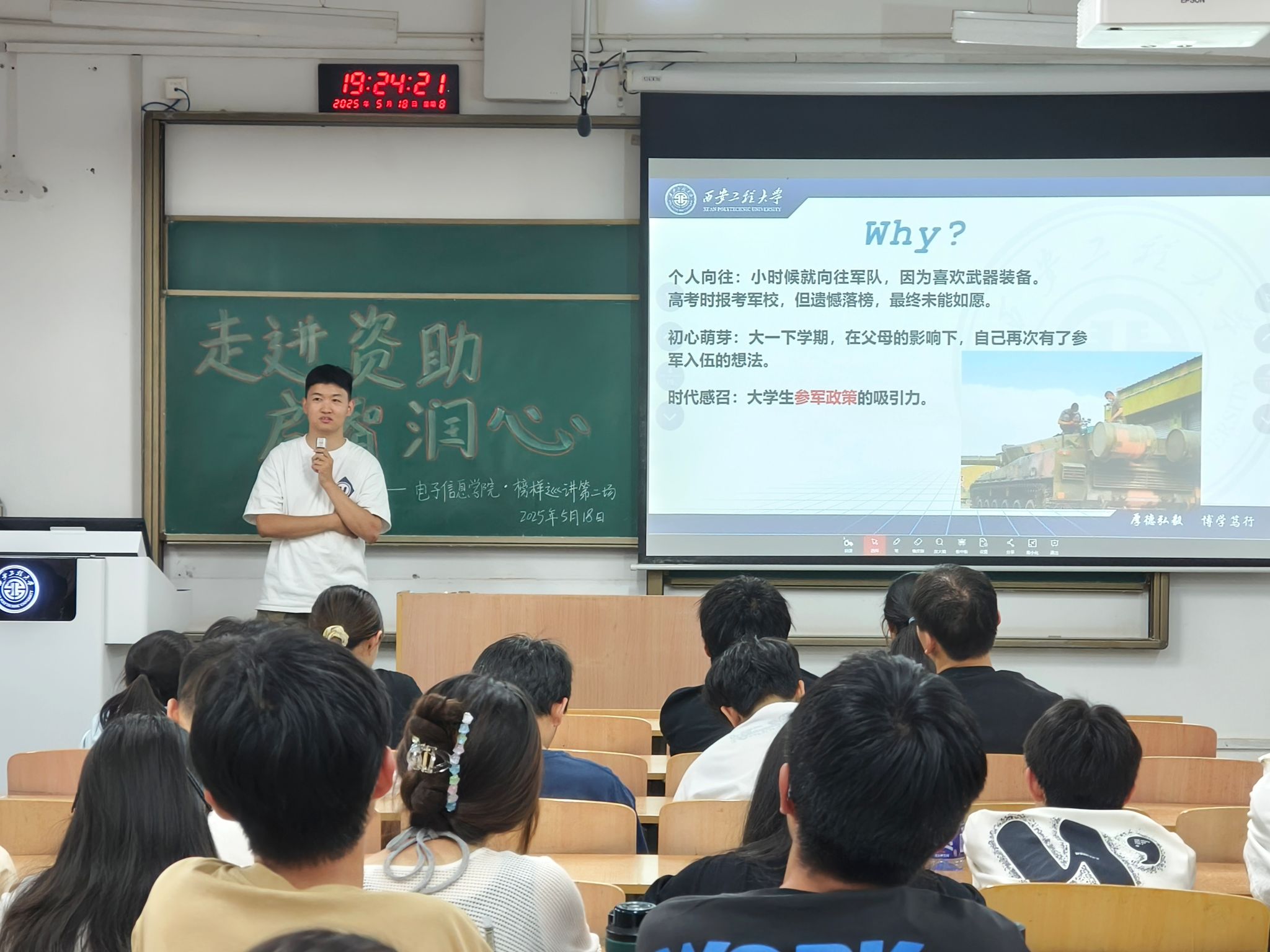 苗青青以《等风来,不如追风去》为题进行了近一个小时的分享交流,她重点结合自身考取国家电网的经历,为在场的同学们毫无保留地剖析面试中的关键要点,从面试过程中的应答策略,到如何展现个人优势与独特魅力,全方位为大家传授实战经验,并鼓励学弟学妹们不要害怕迷茫,要勇于在暂时的挫折中找准方向、汲取力量。李子鹏以《携笔从戎 淬炼成钢》为题,重点围绕“参军入伍的原因、参军入伍的经历、学习经验及未来规划”等内容,宣讲了服兵役员工国家教育资助政策,引导大家要爱国爱校,要坚守“勤勉求学”的本分,不断锤炼内功,为更好的谱写人生篇章蓄势赋能。分享结束后,同学们纷纷表示:“本次榜样巡讲犹如甘霖,不仅是经验的传递,更是希望的播撒,榜样精神在自己心里扎根,给予了自己前进的动力。”