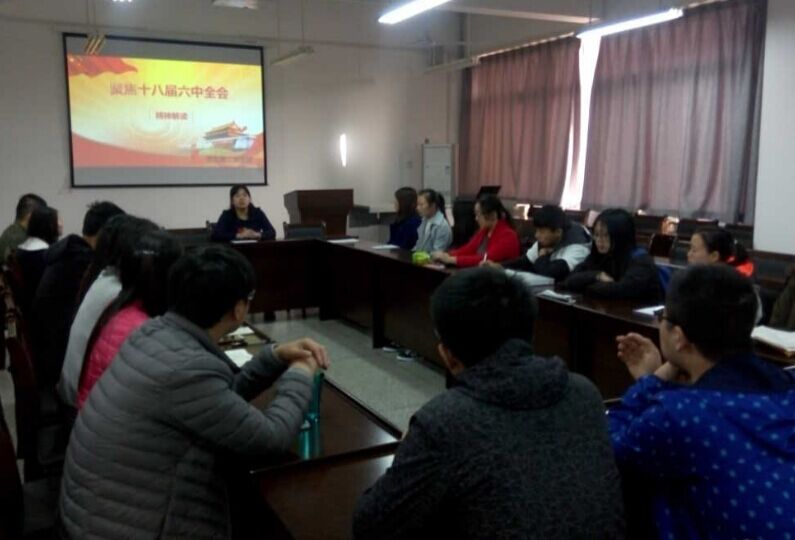 首先,支部书记朱宇军站在一名合格党员的立场上,严肃提出支部议事重在从小事入手,强调要严抓纪律、紧促风气,并对各员工党员提出要求严于律己、重规重纪。接着,常婉妮带领大家认真学习了《中国共产党第十八届中央委员会第六次全体会议公报》,并对公报中“全面从严治、党领导核心、党内政治生活”等12大关键词做了重点解读,呼吁员工党员要牢固树立踏实做事、干净做人的思想意识,真正起到先锋模范带头作用,用实际行动贯彻落实六中全会的精神。党支部副书记姜静波表达了自己对十八届六中全会主要精神的认识和理解,并阐明作为员工党员要加强自己的党性修养,从自身做起,从小事做起,严格要求自己,严守党纪党规,自觉接受同学老师的监督。