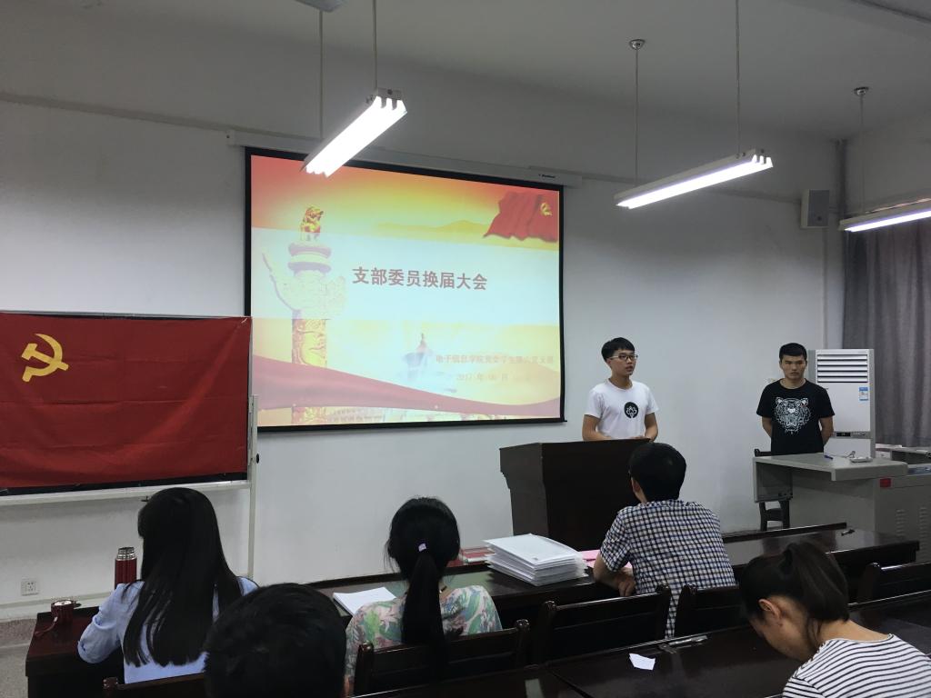 大会第三项,支部换届。袁正康、孙婧雯、张辉同志分别发表了竞选演讲。他们表达了在以后的工作中踏实做事、在生活中严于律己、全心全意为同学们服务的决心。经过选举,袁正康当选了下一届的党支部副书记,孙婧雯成为宣传委员,张辉成为组织委员。