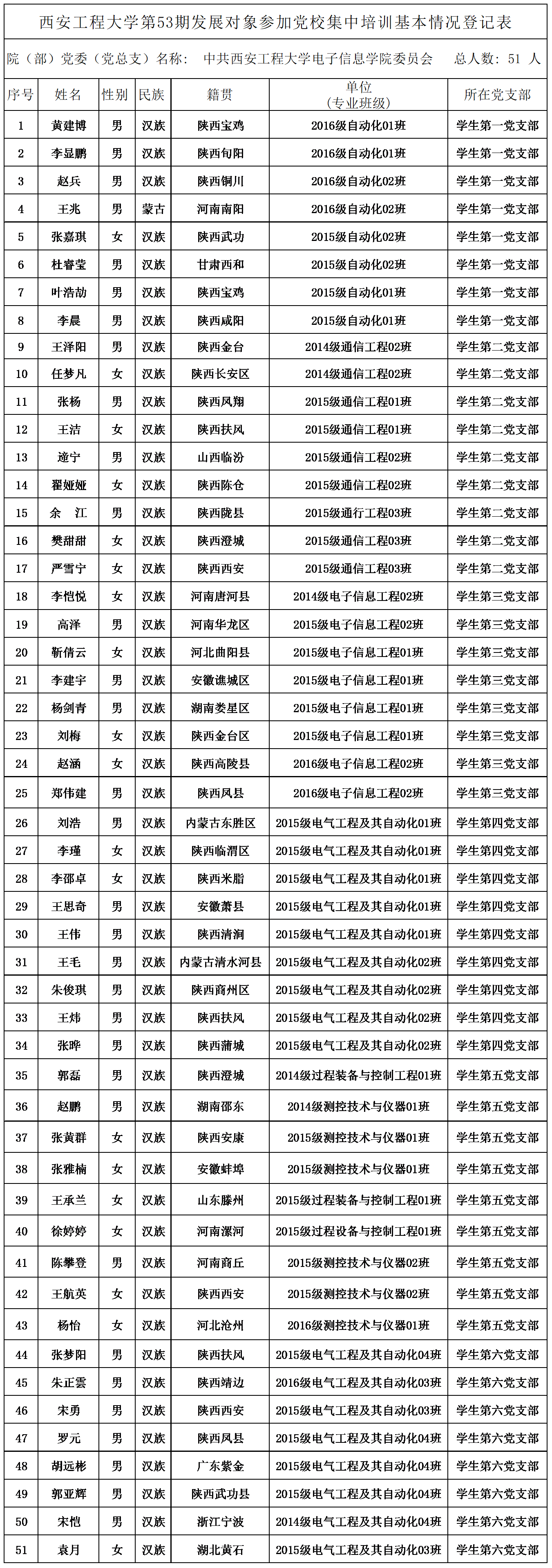 根据陕西省发展党员规程和公司党委下发的关于做好校第53期发展对象参加党课培训要求,公司党委积极部署落实,拟定发展对象名单,现予以公示,公示期为2017年10月13日至2017年10月15日,此期间内若有异议,请联系员工第四党支部书记刘风萍老师。公示如下: