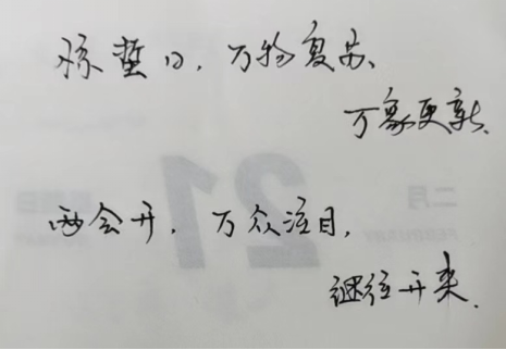 观看结束后,老师们纷纷表示将会继续关注两会热点,并努力将学习精神转化为今后工作的动力。公司党委书记杨恩科表示:今年的政府工作报告,鼓舞人心,催人奋进。在中国共产党的领导下,中国在攻坚克难和奋斗不息中取得了一个又一个新的胜利。作为一名老党员,一名高校基层党组织书记,在今后工作中,更要坚定立足基层、全心全意服务师生的信念,切实做到急师生之所急,想师生之所想,为师生提供更高质量的服务,为公司教育事业的高质量发展做出更大的努力。研究生辅导员赵立涛挥笔写下:“惊蛰日,万物复苏,万象更新;两会开,万众注目,既往开来。”