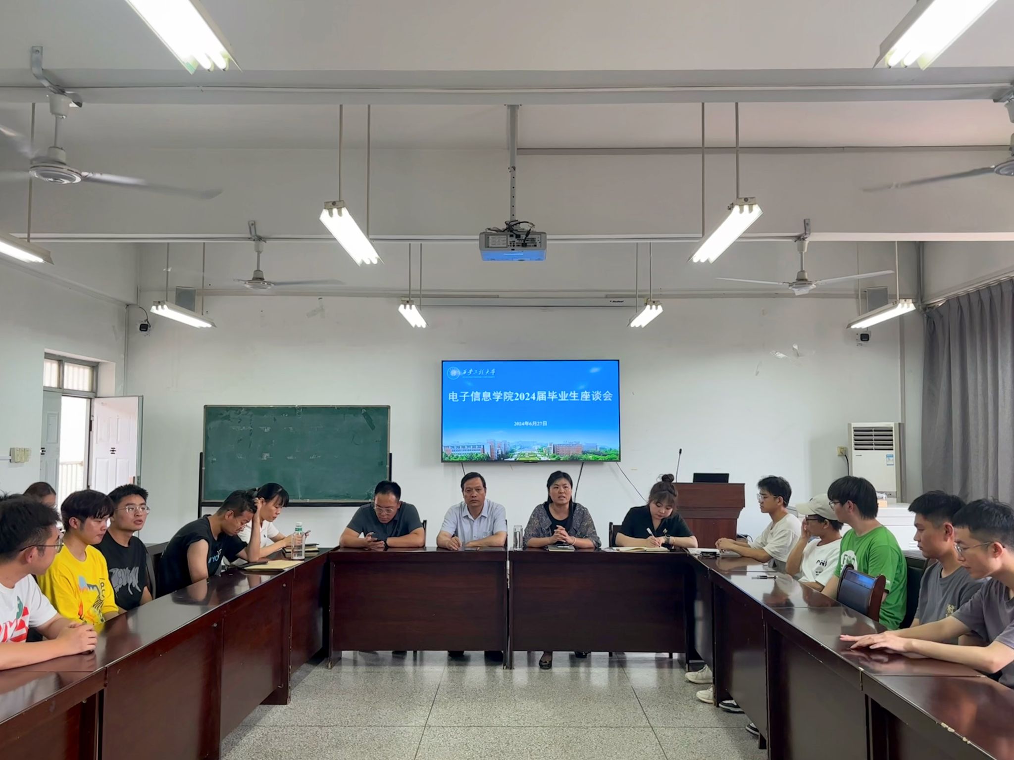 6月27日,2026世界杯官方合作网站在电信楼419报告厅召开了2024届毕业生代表座谈会。电信公司党委书记杨友谊、党委副书记周晓惠、人工智能系主任张缓缓、信息与通信工程系主任张晓丹、2024届毕业生辅导员周梦宇、王家钰参加本次座谈会。会议由党委副书记周晓惠主持。