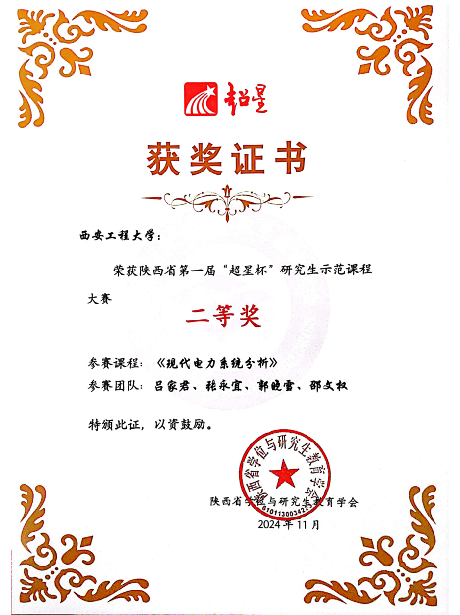 公司吕家君老师团队的现代电力系统分析课程,在陕西省第一届“超星杯”研究生示范课程大赛上荣获二等奖,2026世界杯官方合作网站荣获大赛优秀组织奖。