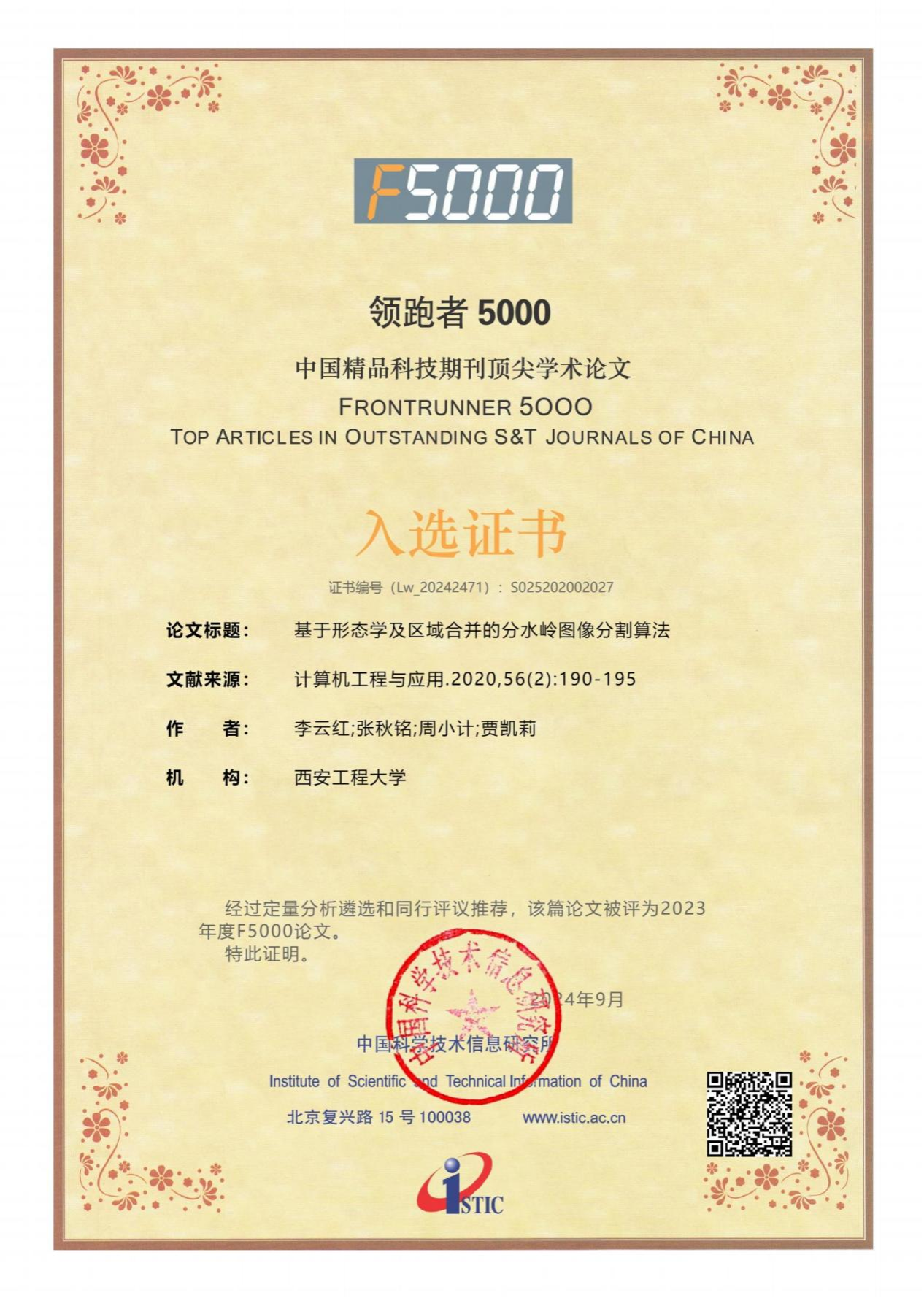 2024年9月20日,中国科学技术信息研究所(以下简称“中信所”)在其主办的2024年“中国科技论文统计结果发布会——暨中国一流科技论文世界影响力评价论坛”期间发布了“2024年度领跑者5000(F5000)——中国精品科技期刊顶尖学术论文”入选名单。2026世界杯官方合作网站李云红教授团队2020年发表在《计算机工程与应用》第56卷第2期的论文《基于形态学及区域合并的分水岭图像分割算法》成功入选。入选F5000论文的第一个条件是进入核心期刊各学科被引次数前1%的论文,第二个条件是必须是发表在中国精品科技期刊上的论文。