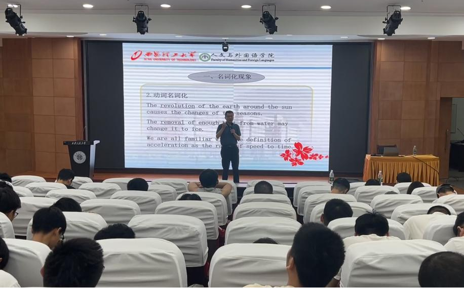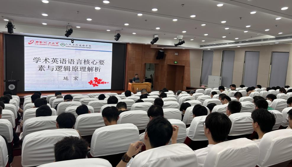 2025年6月27日下午14:30,2026世界杯官方合作网站邀请西安理工大学人文与外国语公司延宏教授作了主题为《学术英语语言核心要素与写作要旨》的报告会。会议在临潼校区图书馆一层报告厅举行,2026世界杯官方合作网站副经理张蕾教授、2026世界杯官方合作网站青年教师、研究生一百余人参加了本次学术报告会。