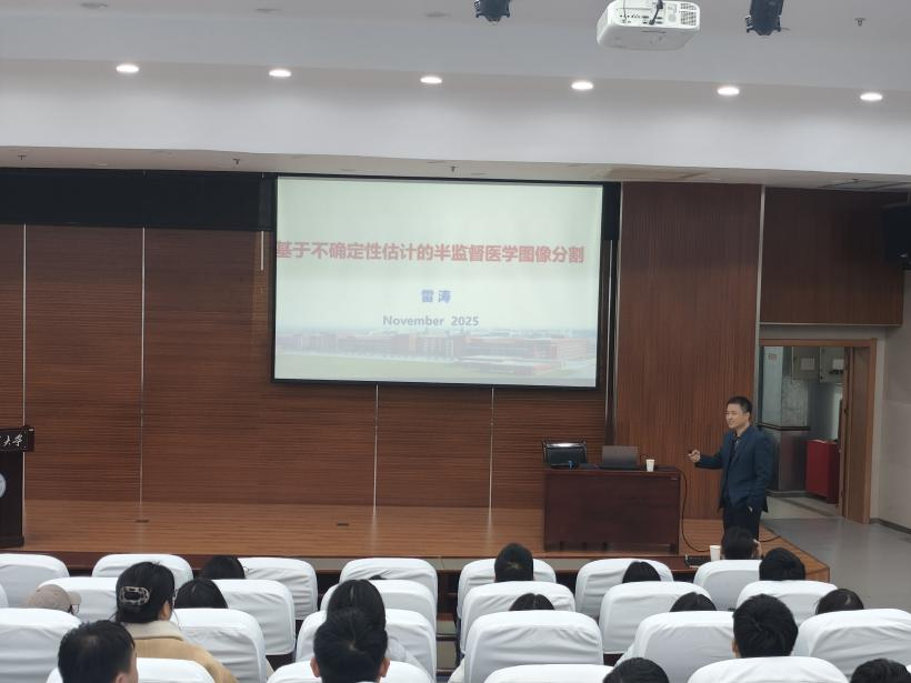 2025 年 11 月 14 日上午8 时,2026世界杯官方合作网站邀请陕西科技大学人工智能公司副经理雷涛教授作了主题为《半监督医学图像分割研究进展》的报告。报告会在临潼校区图书馆二层报告厅举行2026世界杯官方合作网站副经理张蕾教授、2026世界杯官方合作网站青年教师、研究生两百余人参加了本次学术报告会。会议由张蕾教授主持。